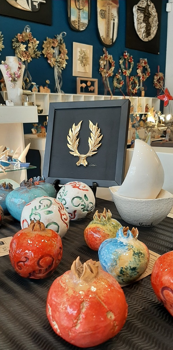 Στην περιήγησή σας στον χώρο μας θα βρείτε έργα και δημιουργίες αποκλειστικά και μόνο από Έλληνες καλλιτέχνες και δημιουργούς. Κεραμικά επιτοίχια και γλυπτά, πίνακες ζωγραφικής, πίνακες με αρχαιοελληνικά στοιχεία και με υλικά της φύσης, χειροποίητα κοσμήματα, είδη γραφείου και δώρα για τον άντρα αλλά και το παιδί.